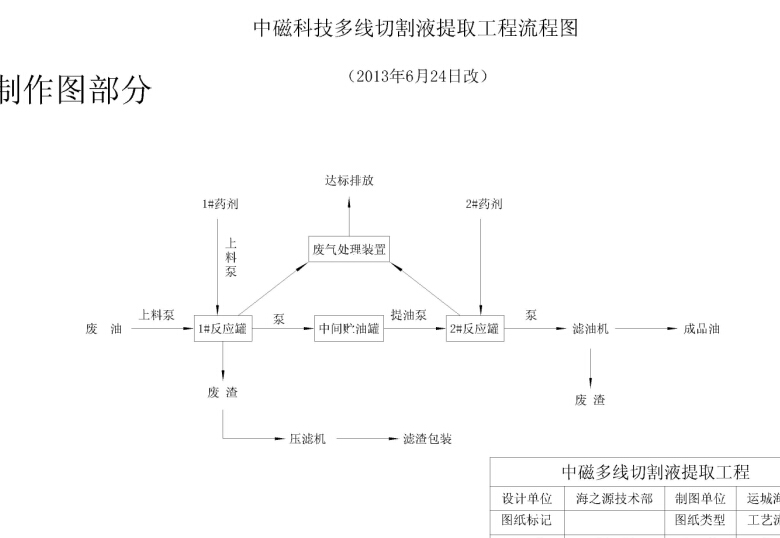 多線切割廢液先進行離心分離,將大多數的較大碳化硅及磁鐵顆粒分離出來,分離后廢渣進入1#廢渣貯罐,廢液進入1#反應器內加入1#、2#藥劑進行化學反應,廢液中的小粒徑顆粒被分層分離,廢渣通過1#反應罐下部的閥門排入廢渣貯罐,而多線切割液排入中間貯油罐進行再分離,分離后油在2#反應罐內加入3#藥劑,在加熱的情況下進行進一步精制,精制后的油經過濾油機過濾處理,流入成品油罐,濾餅外運處理。