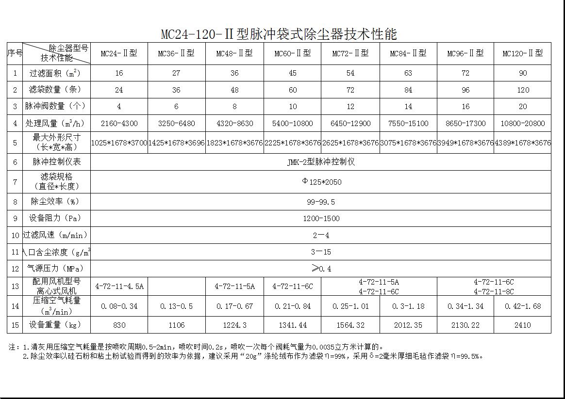 MC-Ⅱ型脈沖袋式除塵器有灰斗,進氣口,上箱體、下箱體(內置除塵過濾布袋)、出氣口、引風機、電磁閥及配套氣泵組成。工作時,含塵氣體由進氣口進入灰斗,粗粒塵直接落入灰斗底部,細粒塵隨氣流向上進入上箱體,粉塵積附在濾袋外表面,凈氣通過各濾袋口匯集到上箱體內至出氣口經引風機排出。隨過濾過程的不斷進行,濾袋外表層積塵逐漸增多,從而使收塵器阻力增高,當阻力升至一定范圍(1200~1500Pa),清灰控制系統發出信號,通過自動脈沖控制儀打開脈沖閥,壓縮空氣經噴管向每條濾袋噴射氣流,使濾袋產生變形,震動,積附在濾袋外表面的粉塵被吹落至灰斗內,達到清灰的目的。