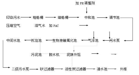 印染污水經(jīng)粗、細(xì)格柵除懸浮物、漂浮物及大顆粒的雜質(zhì)等之后,進(jìn)入中和池,由加藥裝置加入PH調(diào)整劑,進(jìn)行調(diào)整污水的PH值;達(dá)到中性后,進(jìn)入污水調(diào)節(jié)池,由調(diào)節(jié)池調(diào)節(jié)污水的水量及水質(zhì),并進(jìn)行預(yù)曝氣處理,調(diào)節(jié)之后的污水由污水提升泵提升到氣浮裝置(泵前投加凝絮劑和助凝劑),經(jīng)溶氣水作用,達(dá)到固液分離的效果。浮渣由刮渣機(jī)運(yùn)作排入?yún)R集于污泥濃縮池中處理,上清液自流入生物接觸氧化池,加入空氣使氧化池內(nèi)的填料上生長(zhǎng)出好氧菌,并活躍生長(zhǎng),以此去除水中的有機(jī)物質(zhì),達(dá)到凈化的目的。 經(jīng)好氧處理之后的污水進(jìn)入二次沉淀池中,再進(jìn)行固液分離,上清液進(jìn)入中間水池,污泥匯集于污泥池中處理,中間水池的污水由污水泵抽入砂過(guò)濾器進(jìn)一步去除水中的SS等物質(zhì),再進(jìn)入活性炭過(guò)濾器,利用活性炭的吸附功能,對(duì)污水中的色度及有機(jī)物質(zhì)進(jìn)行吸附過(guò)濾,使污水達(dá)標(biāo)排入清水池中排放。 清水池兼作砂過(guò)濾器和活性炭過(guò)濾器的反沖洗水池。 對(duì)于氣浮池中的浮渣、沉淀池中的污泥、過(guò)濾器的反沖排污都匯集于污泥濃縮池中進(jìn)行濃縮處理,再進(jìn)行污泥脫水機(jī)處理,上清液回流至調(diào)節(jié)池中再處理,泥餅外運(yùn)埋填。